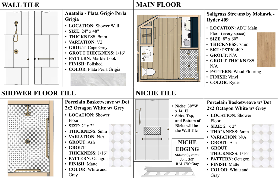 The attached pictures are the clients’ selections, floorplans, and renderings of their “Cypress” ADU designed by Blue Ribbon!